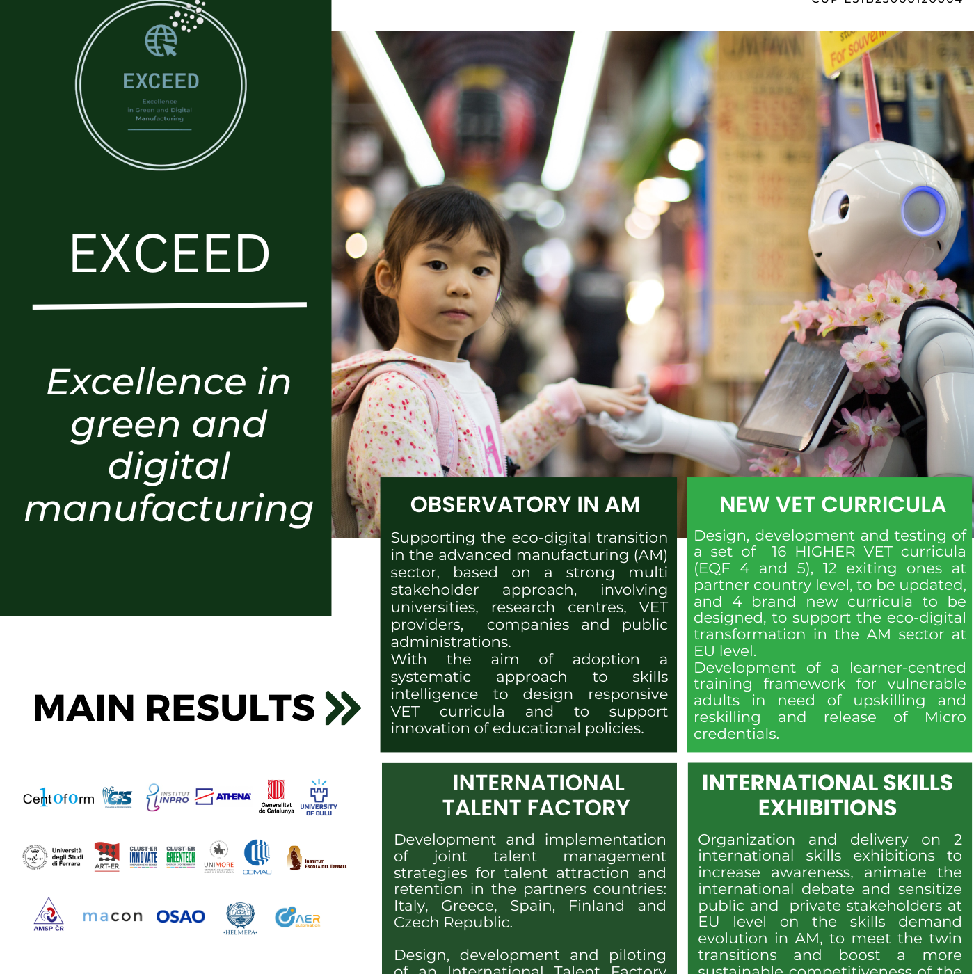 The EXCEED – EXCELLENCE IN GREEN AND DIGITAL MANUFACTURING project aims at creating a European network of 6 centres of vocational excellence in 5 countries to support innovation and sustainable competitiveness of the Advanced Manufacturing (AM) sector. To face these challenges, vocational education providers play a crucial role in preparing the workforce and in shaping the society of the future.